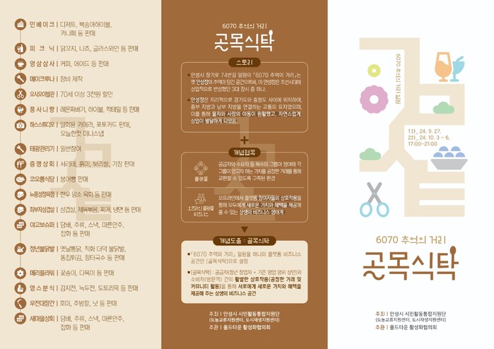 안성시는 오는 27일(금) 6070 추억의 거리(장기로 74번길 일원)에서 골목식탁 행사를 개최한다고 밝혔다.