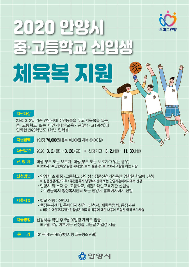 [안양=로컬라이프] 송준형 기자 = 안양시가 2020학년도 중·고등학교 신입생 교복·체육복 구입비용 지원을 시작한다고 17일 밝혔다.