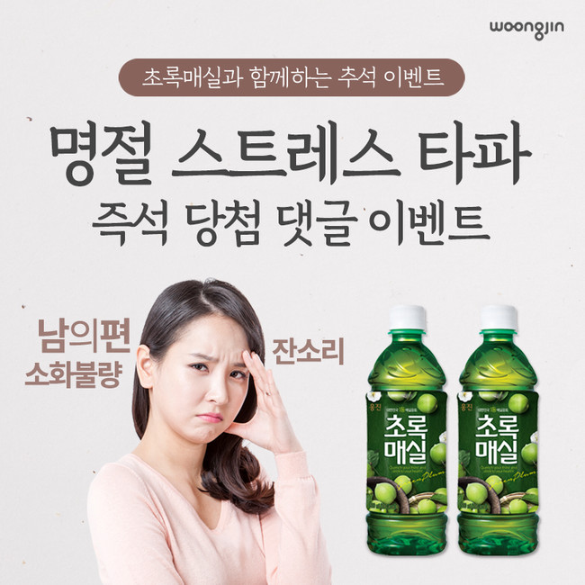 이번 이벤트는 웅진식품 홈페이지에서 9월 28일부터 오는 10월 12일까지 진행된다. 명절 스트레스를 유발하는 원인과, 관련 에피소드 등을 댓글로 남기면 응모가 완료된다. 경품은 ‘초록매실’ 500mL 페트 스무 병으로, 즉석 당첨 형식을 통해 총 15명의 소비자에게 증정된다.