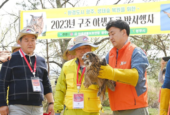 [로컬라이프] 송준형 기자 = 경기도 광주시 경안천습지생태공원의 야생생물보호연합회에서 구조해 보살피던 수리부엉이 2마리와 황조롱이 3마리를 자연으로 되돌려 보냈다.