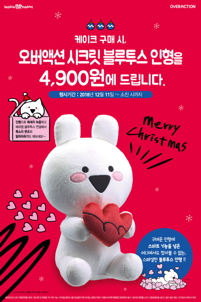 이번 프로모션은 배스킨라빈스 매장에서 크리스마스 아이스크림 케이크를 구매하면 4,900원에 ‘오버액션 시크릿 블루투스 인형’을 증정하는 행사다.