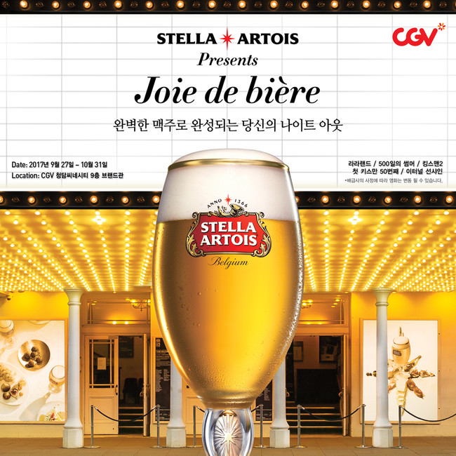 벨기에 전통의 프리미엄 맥주 ‘스텔라 아르투아(Stella Artois)’가 지난 27일 서울 CGV 청담 씨네시티에 브랜드 전용관 개관과 함께 ‘주아 드 비에(Joie de bière)’ 이벤트를 10월 31일까지 약 한 달간 선보인다.