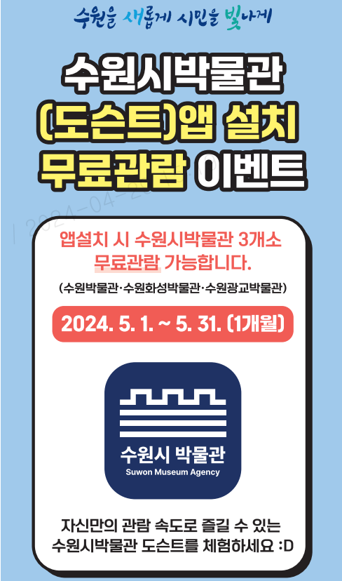 수원시박물관이 가정의 달을 맞아 수원시박물관 앱을 설치한 시민에게 5월 1일부터 31일까지 수원·수원화성·수원광교 박물관을 무료로 개방한다.