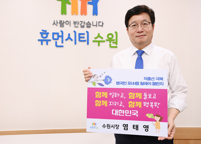 염태영 수원시장이 ‘저출산 극복 함께해요! 범국민 포(4)함 릴레이 챌린지’에 동참하며 “출산과 육아가 더는 부모만의 부담이 되지 않는 환경을 만들어야 한다”고 강조했다.