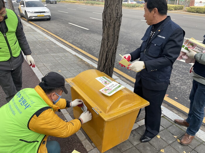 이날 가로수 정원사 봉사단·건강검진단 등 20여 명은 겨울철 제설제 피해를 알리는 스티커를 도로변 제설함에 부착했다. 또 시민들에게 가로수 밑에 쌓인 눈으로 인한 가로수 생육 피해를 알렸다.