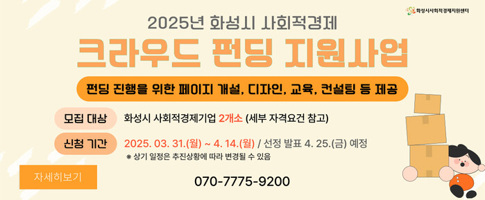 화성특례시(시장 정명근)가 ‘2025년 화성시 사회적경제 크라우드펀딩 지원사업’으로 관내 사회적경제기업의 온라인 판로 확대에 나선다.