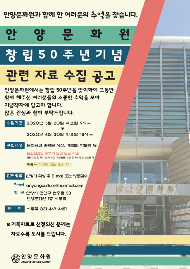 신청서는 안양문화원 홈페이지(anyangculture.or.kr)에서 내려 받을 수 있다. 시는 이와 함께 문화원이 소재한 안양5동의 역사를 가늠할 ‘안양5동 마을지’도 제작하기로 하고, 관련한 옛 사진과 간행물 등을 문화원 50년사와 같이 수집한다.