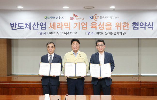 <사진/ 지난 6월10일 이천시와 SK하이닉스, 한국세라믹기술원이 이천시세라믹종합솔루션센터 설립과 활성화를 위해 공동협력키로 하는 양해각서 체결 모습.>