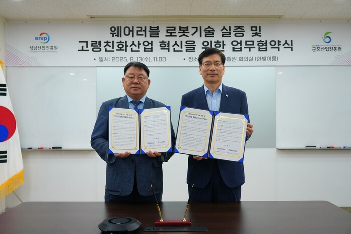 군포산업진흥원(원장 유병직) 웨어러블 로봇 실증센터와 성남산업진흥원(원장 이의준) 시니어산업혁신센터는 8월 13일 성남시에서 웨어러블 로봇 기술 실증과 고령친화산업 산업 혁신을 위한 업무협약(MOU)을 체결했다.