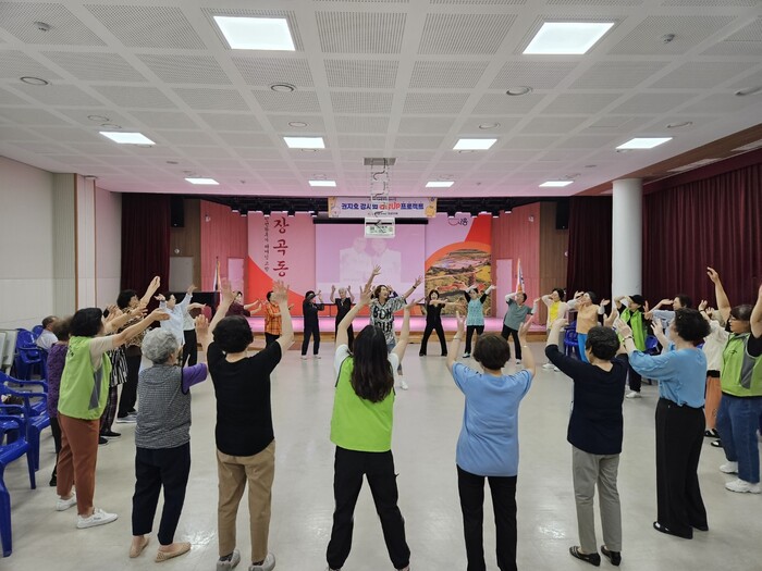 이번 ‘건강업(UP) 프로젝트(2회차)’는 장곡동 행정복지센터 3층 강당에서 운영됐으며 관내 노인 30여 명이 참여했다. 한국자격인증교육원 시니어 교육 강사인 권지호 강사가 건강 박수 7가지, 백업봉 근력운동, 실버 댄스, 스트레칭 등 일상생활에서 할 수 있는 체조 동작을 교육했다.