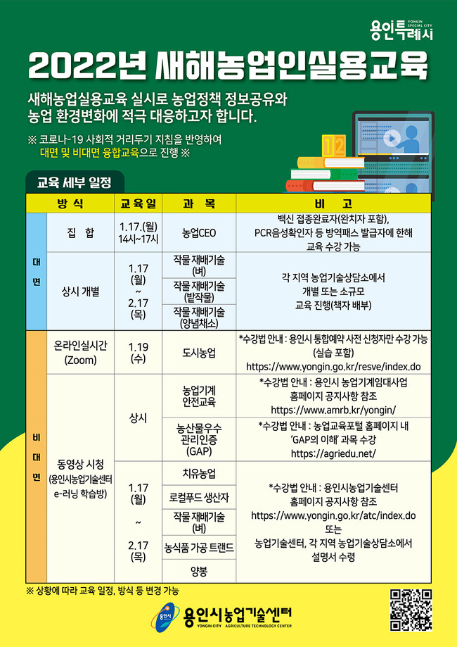 용인시는 ‘새해농업인실용교육’을 1월 17일부터 2월 17일까지 온·오프라인으로 병행해 운영한다고 4일 밝혔다.