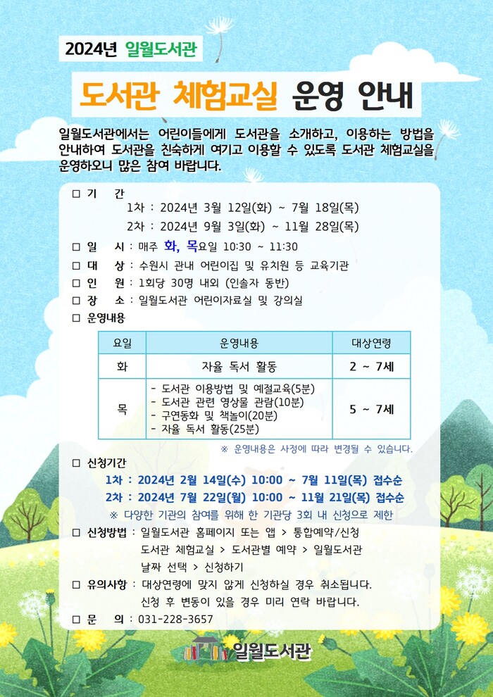 수원시 일월도서관이 ‘2024년 도서관 체험교실’에 참여할 어린이집·유치원 등을 모집한다.