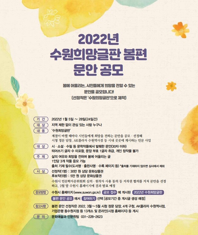 수원시가 ‘2022년 수원희망글판 봄편’ 문안을 5일부터 28일 18시까지 공모한다.