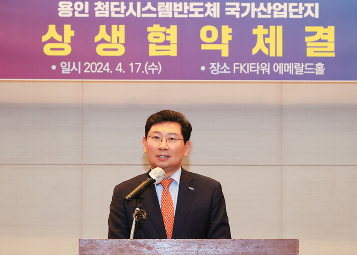 사진/이상일 용인특례시장이 지난 4월 17일 서울 FKI타워 에메랄드홀에서 열린 용인 첨단시스템반도체 국가산업단지 상생협약체결식에서 인사말을 하고있다.(사진제공=용인시)
