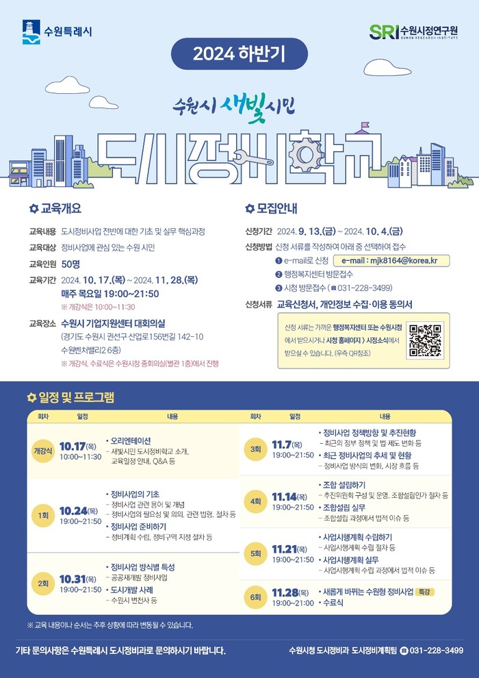 수원시(시장 이재준)가 도시정비사업 시민 전문가를 양성하는 ‘새빛시민 도시정비학교’ 제2기 교육생을 10월 4일까지 모집한다.