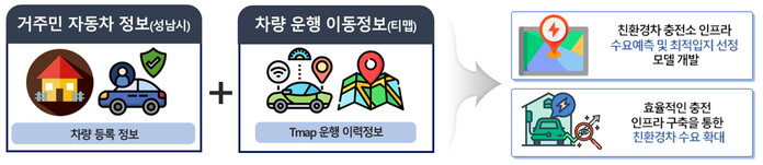 전기차, 수소차 등의 충전 시설 수요 예측과 최적 입지 분석 모델 개발에는 가명 처리된 성남시의 차량등록 정보와 티맵모빌리티의 차량 운행 이동정보가 활용된다.