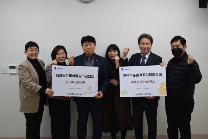 수원시휴먼서비스센터에서 열린 기부금·물품 전달식에는 윤영묵 대한농산물식품임가공연합회 수원시지부장, 임주혁 한국추출가공식품업중앙회경기도지부 수원시지회장 등이 참석했다.