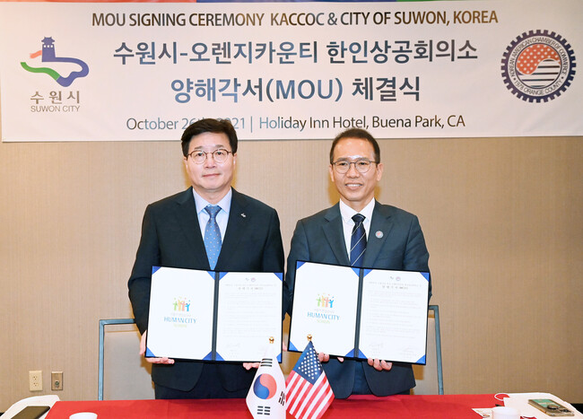 염태영 수원시장은 26일 오후(현지 시각) 오렌지카운티 홀리데이인 부에나파크에서 노상일 KACCOC 회장과 협약을 체결하고, 수원시와 KACCOC 간 협력·교류를 약속했다.