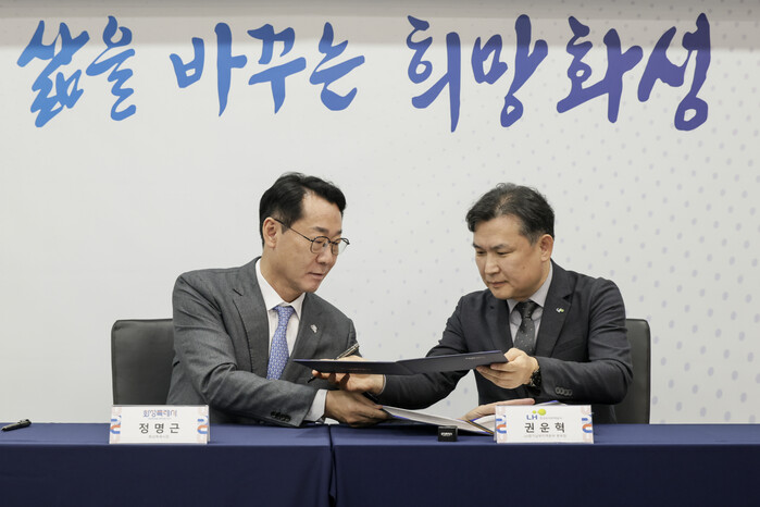 이날 협약식은 정명근 화성특례시장과 권운혁 LH경기남부지역본부장은 협약서에 서명하고 양 기관의 로고 판넬을 맞붙여 ‘집’ 모양을 완성하는 퍼포먼스를 펼쳤다. 퍼포먼스는 ‘필요할 때 곧바로 닿는 보금자리’라는 사업의 의미를 담고 있다.