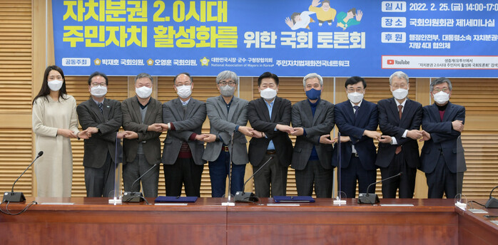 자치분권 2.0시대를 대비하여 주민자치의 법제화 방안을 논의하기 위한 토론회가 대한민국시장·군수·구청장협의회(대표회장 곽상욱 오산시장)와 박재호 국회의원, 오영훈 국회의원, 주민자치법제화전국네트워크의 공동 주최로 2월 25일 (금) 오후 2시, 국회의원회관 제1세미나실에서 열렸다.