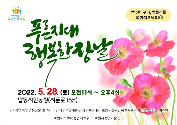수원시농업기술센터가 28일 오전 11시부터 오후 4시까지 탑동 시민농장에서 ‘2022년 푸른지대 행복한 장날’ 행사를 연다.