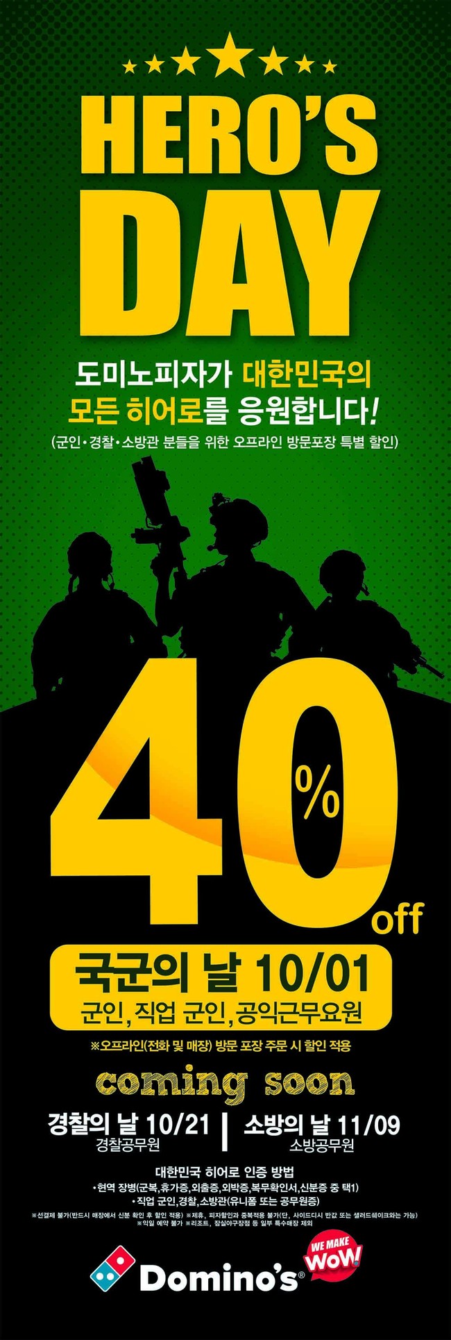 도미노피자가 실시하는 ‘히어로즈 데이(Hero’s Day)’ 프로모션은 국군의 날(10월 1일)을 시작으로 경찰의 날(10월 21일), 소방의 날(11월 9일)에 해당 직업군 종사자에게 따뜻한 응원의 마음을 전달하기 위해 모든 피자를 40% 할인된 가격에 제공하는 나눔 이벤트다.