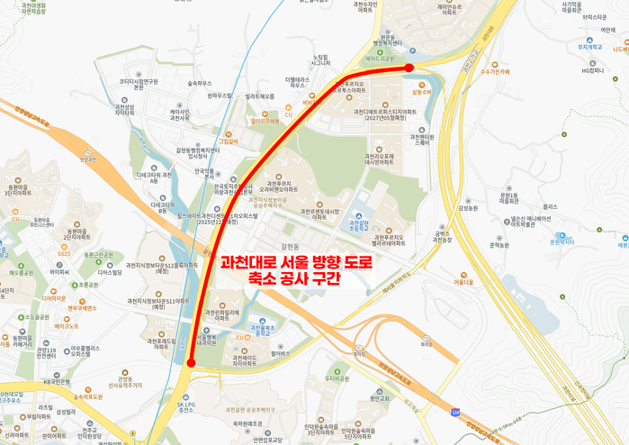과천대로 축소 공사 구간은 과천포레드림아파트 앞 도로부터 과천디에트로퍼스티지아파트 앞 도로까지로, 올해 연말까지 서울 방향 도로 축소 공사를 완료하고, 내년 중 안양 방향 도로 축소 공사 완료를 목표로 하고 있다.