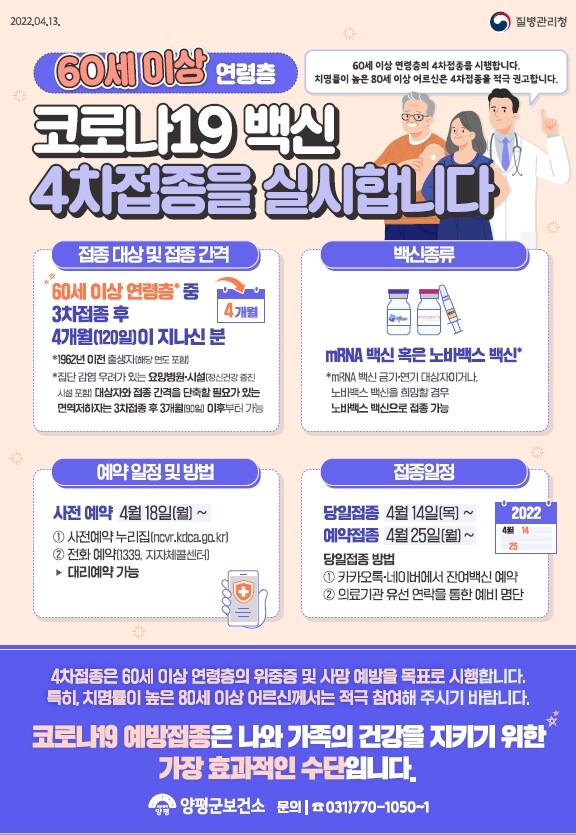 양평군(군수 정동균)이 지난 14일부터 60세 이상의 고령층을 대상으로 코로나19 4차 예방접종을 시작했다. 이는 오미크론 변이 유행에 따라 고령층의 확진·사망이 증가하는 상황에서, 감염 시 중증 사망 위험이 높은 고위험군에 대한 보호 강화 필요에 따른 조치다.