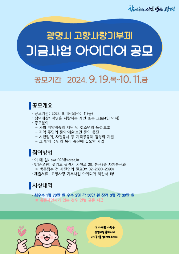 광명시(시장 박승원)는 기부자가 공감하고 지역주민이 만족하는 ‘광명시 고향사랑 기금사업’을 위해 시민의 아이디어를 모은다.