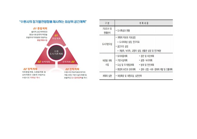 ‘수원도시기본계획’은 수원시의 공간구조, 지향해야 할 바람직한 미래상, 발전 방향을 제시하는 ‘20년 장기발전 종합계획’이자 ‘법정 최상위 공간계획’이다. 현재 관련 용역비를 확보하고, 계획 수립을 위한 용역업체 선정을 완료했다.