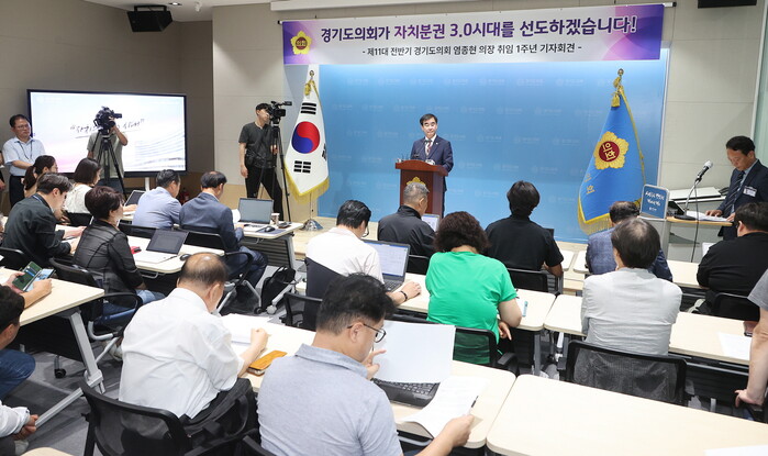 [로컬라이프] 염종현 경기도의회 의장이 9일 의회 브리핑룸에서 취임 1주년 기자회견을 열고 “제11대 의회 전반기 남은 1년 간 ‘자치분권3.0 시대’를 선도하겠다”라는 포부를 밝혔다.