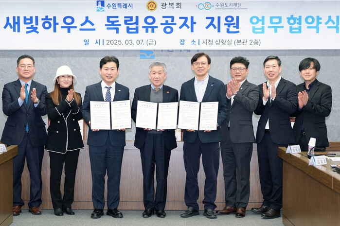 수원시(시장 이재준)는 7일 시청 상황실에서 광복회 수원시지회, 수원도시재단과 ‘새빛하우스 독립유공자 지원 업무협약’을 체결하고 협력을 약속했다.