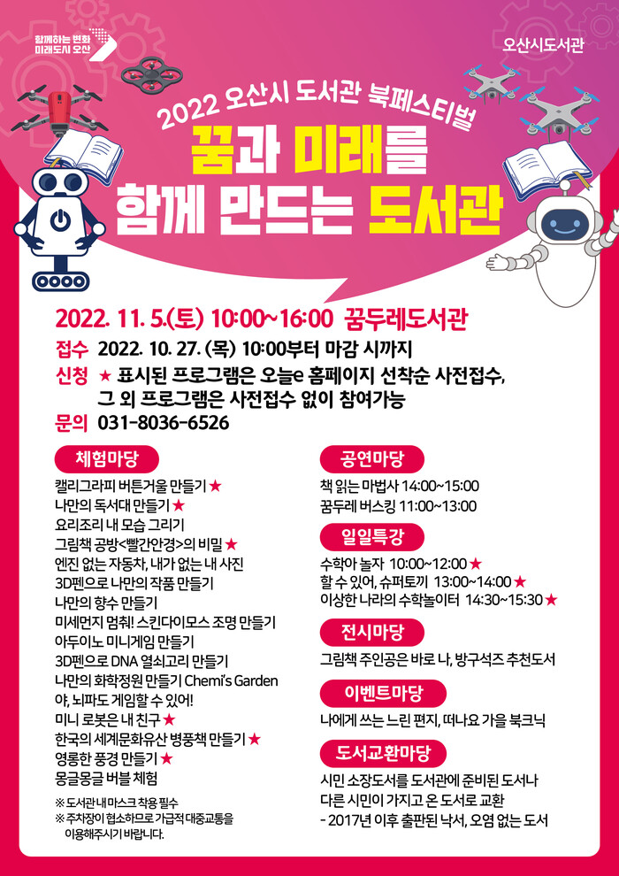 북 페스티벌 관련 자세한 내용은 오산시 도서관 홈페이지에서 확인할 수 있으며, 꿈두레도서관(031-8036-6526)으로 전화 문의하면 안내받을 수 있다.