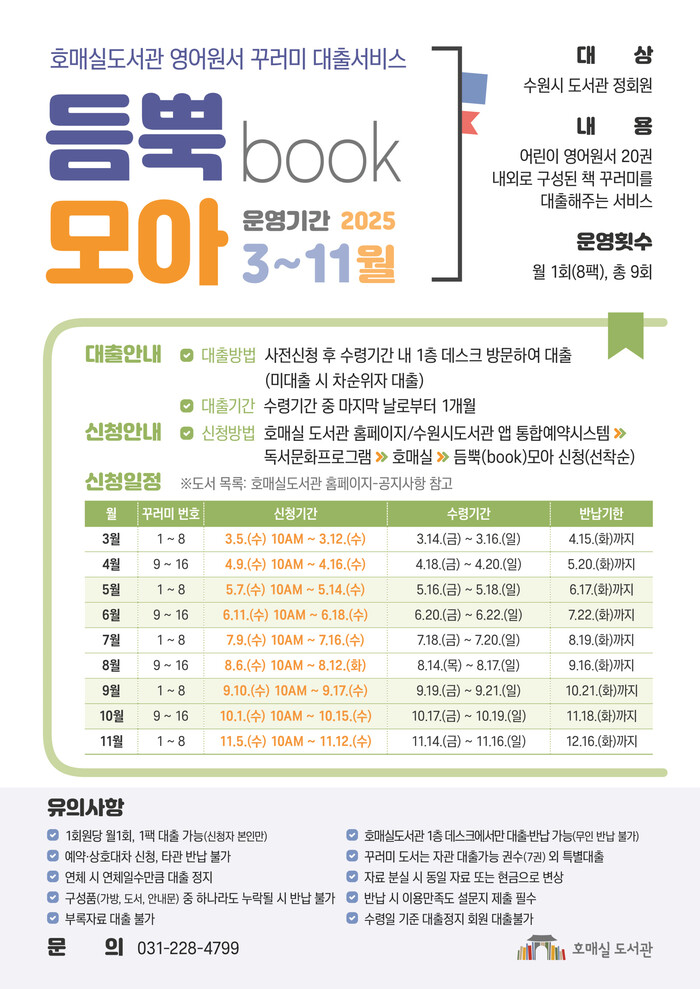 수원시 호매실도서관이 3월 5일부터 어린이 영어원서 20권 내외로 구성된 책 꾸러미를 한 달간 대출해 주는 ‘듬뿍(book)모아’ 서비스를 운영한다.