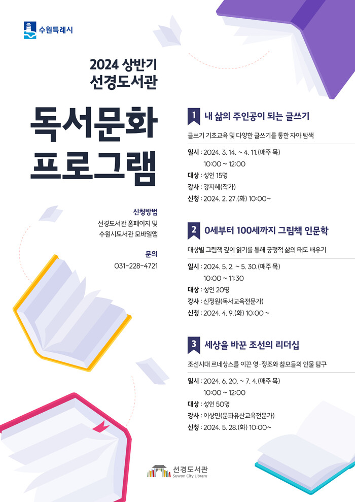 수원시 선경도서관이 독서문화프로그램 ‘내 삶의 주인공이 되는 글쓰기’, ‘0세부터 100세까지 그림책 인문학’, ‘세상을 바꾼 조선의 리더십’에 참가할 시민을 모집한다.