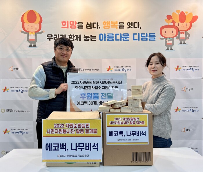 화성시(시장 정명근)가 29일 ‘2023 자원순환실천 시민자원봉사단’의 활동으로 만든 에코백과 전래놀이용 나무비석을 화성시아르딤복지관에 기부했다.