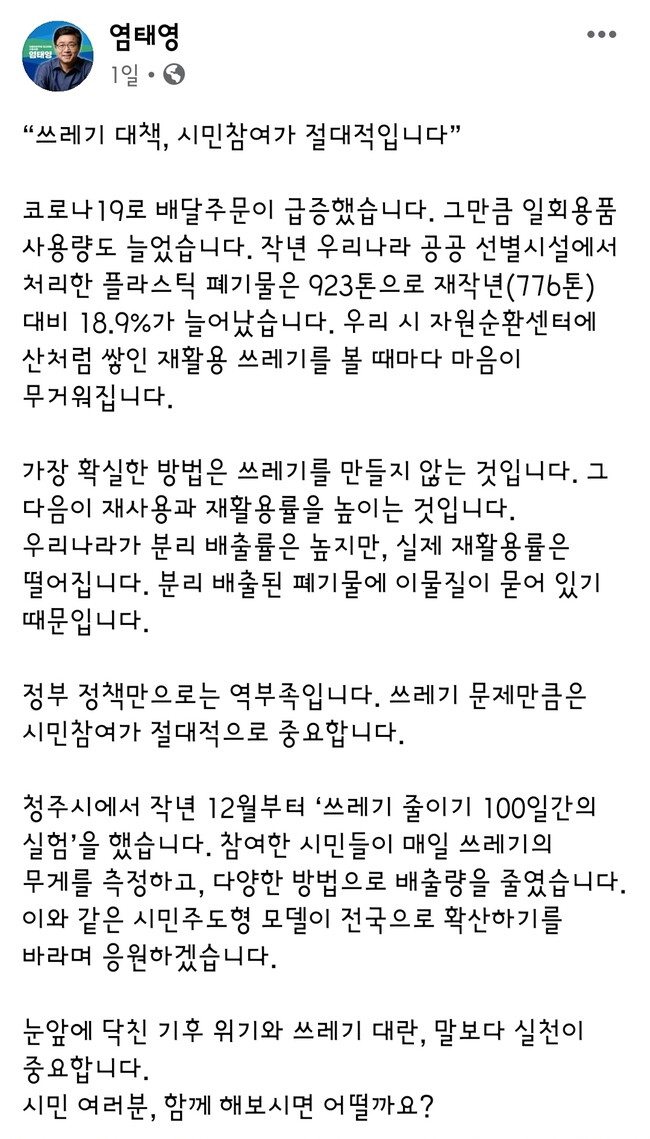 염태영 시장은 “눈앞에 닥친 기후 위기와 쓰레기 대란, 말보다 실천이 중요하다”며 시민들이 동참해 줄 것을 요청했다.