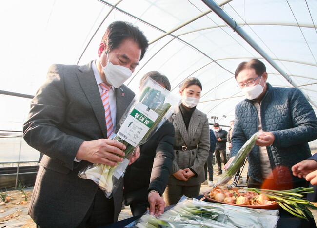이날 첫 출하를 축하하는 기념식에는 백군기 용인시장과 양대파 재배 농업인, 판매처인 이마트 에브리데이 관계자 등 10명이 참석했다.