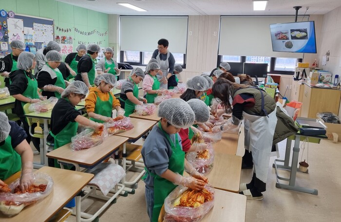 학생들은 최선행 식생활교육 강사의 지도로 관내 전통식품 기업 ㈜토속항아리김치의 김장체험 꾸러미를 활용해 교실에서 김장 김치를 직접 담가보는 시간을 가졌다.