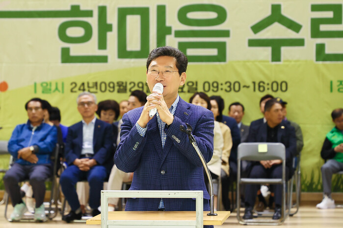 이상일 용인특례시장이 29일 처인구 마평동 실내체육관에서 열린 ‘2024 용인시 새마을회 한마음 수련대회’에 참여해 관계자들을 격려했다.