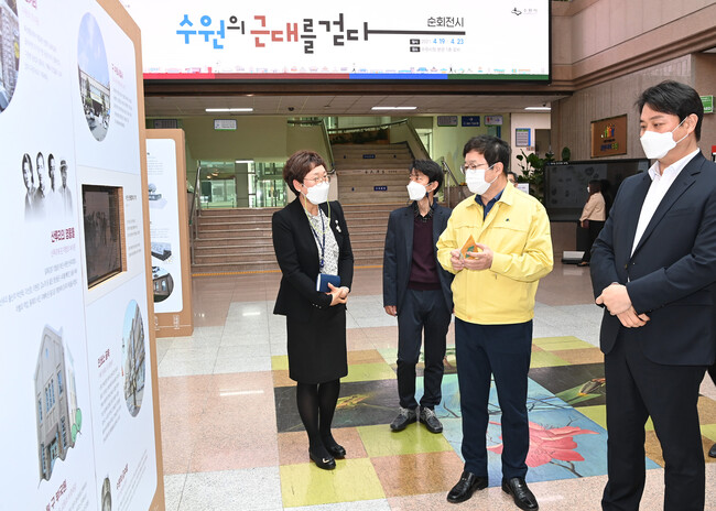 사진/염태영 수원시장이 수원시청 로비에서 진행된 '수원의 근대를 걷다' 순회 전시에서 전시물을 둘러보고 있다. (사진제공=수원시)