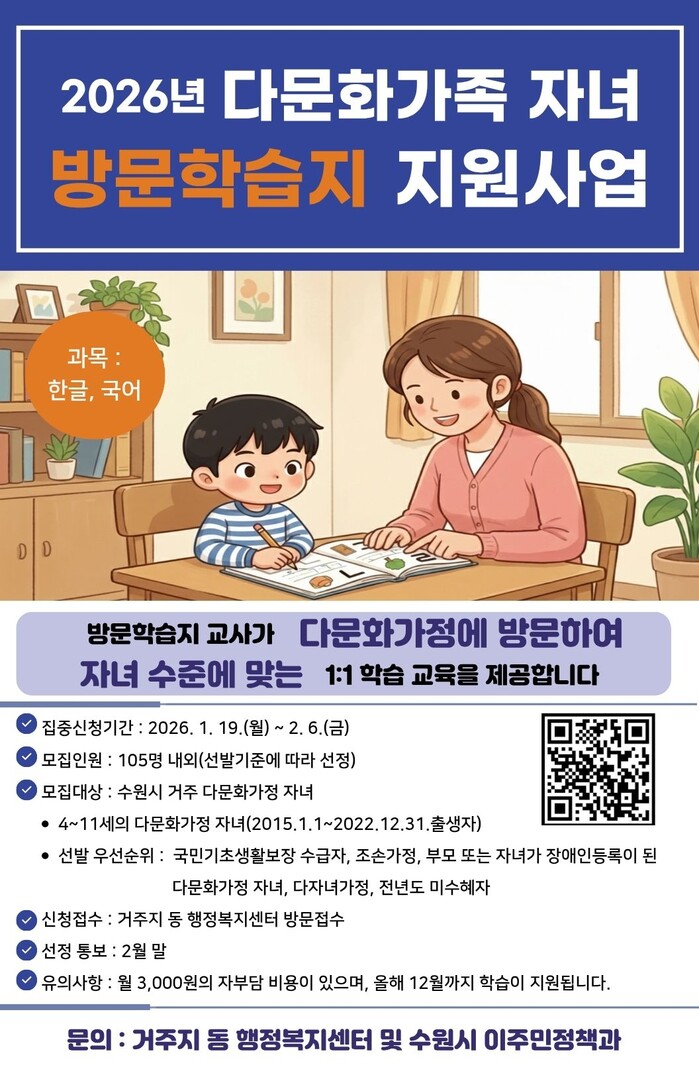 자세한 내용은 수원시 홈페이지(https://www.suwon.go.kr) ‘수원소식→시정소식’ 게시판에서 ‘2026년 다문화가족 자녀 방문학습지 지원 사업 대상자 모집’을 검색해 확인할 수 있다.