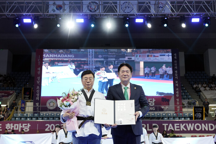 신 시장은 환영사 전 이동섭 국기원장으로부터 태권도 명예 7단 단증을 수여받았다.