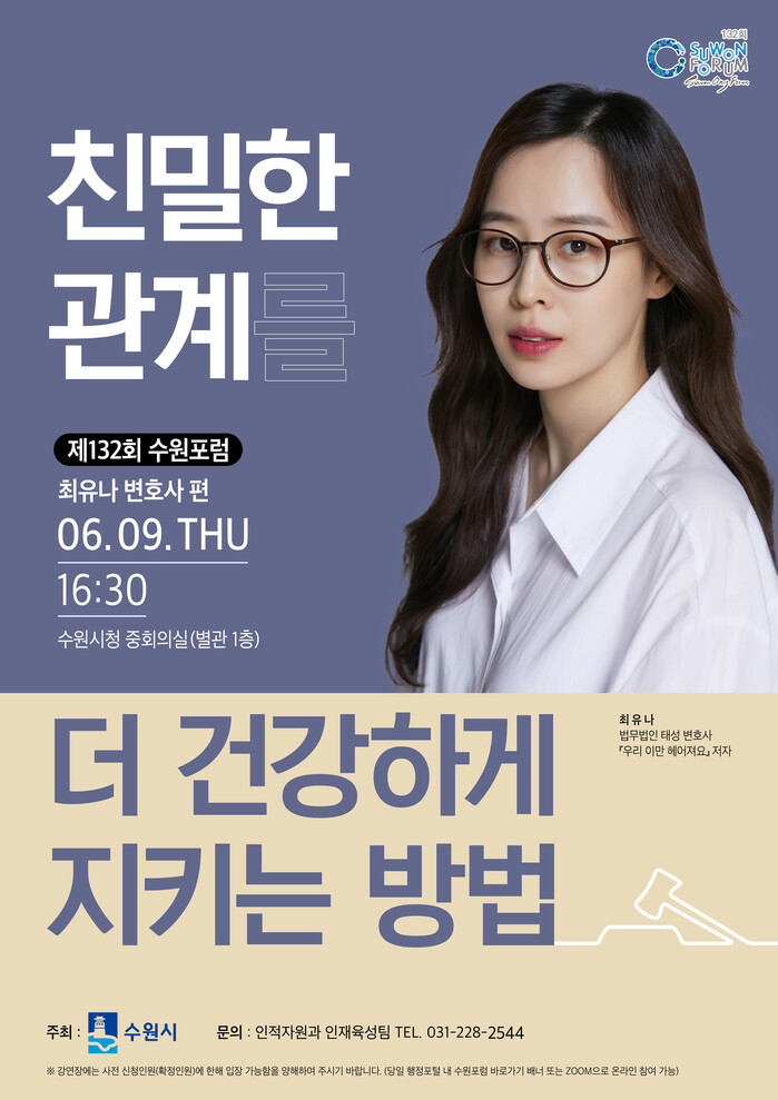수원시가 ‘친밀한 관계를 더 건강하게 지키는 방법’을 주제로 제132회 수원포럼을 연다.