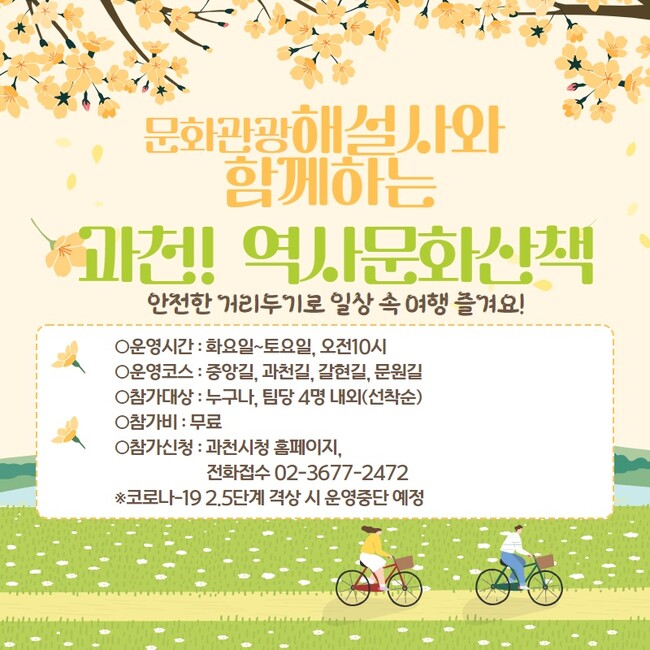 과천시 관계자는 “과천 역사문화산책이 코로나19로 지친 시민들에게 일상 속에서 쉬어가는 기회를 제공할 것으로 기대한다”라고 밝혔다.