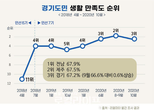 주민 생활 만족도 조사에서도 경기도는 67.2%로 전월보다 1계단 하락한 3위를 기록하긴 했지만, 여전히 상위권을 유지했다.