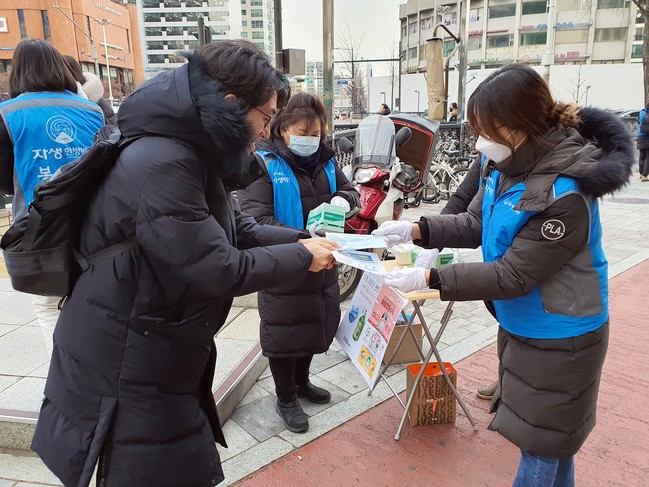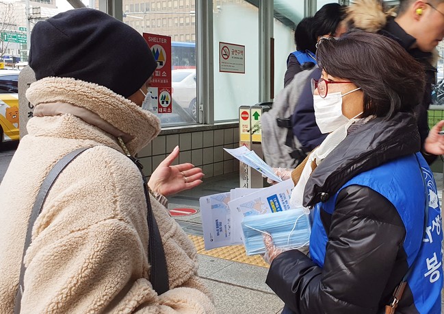 [사진설명] 강남자생봉사단원이 시민에게 마스크를 전달하고 신종 코로나바이러스 감염증 예방법을 설명하고 있다