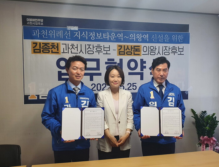 사진/김종천 과천시장 후보(좌)와 이소영 국회의원(의왕·과천), 김상돈 의왕시장 후보(우)가 협약식을 체결하고 있다(사진제공=김종천 캠프)