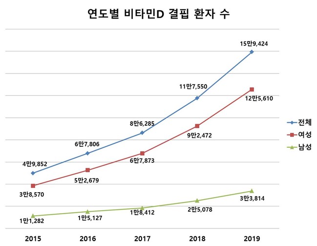 문제는 비타민D 결핍으로 병원은 찾는 이들이 매년 큰 폭으로 증가하고 있다는 점이다. 건강보험심사평가원에 따르면 비타민D 결핍환자는 2015년 4만9852명에서 2019년 15만9424명으로 약 3.2배나 증가했다. 같은 기간 여성 비타민D 결핍환자도 3.2배 증가하는 등 급격하게 증가하는 모습을 보였다.