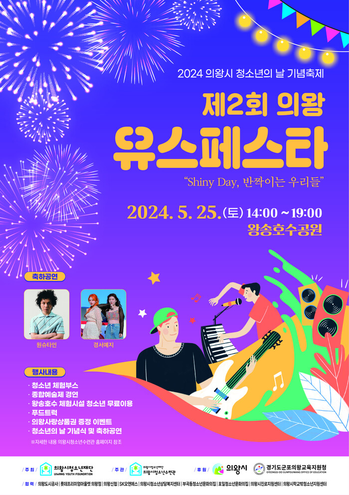 (재)의왕시청소년재단은 제2회 의왕Youth Festa ‘Shiny Day, 반짝이는 우리들’을 5월 25일 왕송호수공원에서 개최한다고 17일 밝혔다.